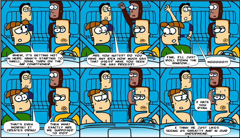 May 18, 2007 Ryan is under the belief that you absolutely cannot turn on the air conditioning or roll down the windows if you want to gt good gas mileage. I saw this on yahoo. Goes to show what Ryan knows! Hey, that rhymes! I think it's almost time for a break from the comic for me. I've been a little burned out lately. I think I might take a short hiatus and work on some other projects I've been wanting to do. I'm going to try to get to 200 before any type of hiatus though. |
