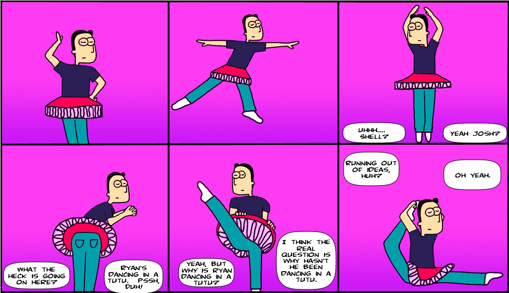 June 6, 2007 Yeah, I was suffering from a case of writer's block. My mom said it would be funny to have a comic of Ryan dancing in a tutu, and so there it is. This is the first comic where Josh's pretty little face doesn't appear, but as you can see, he's still there. |